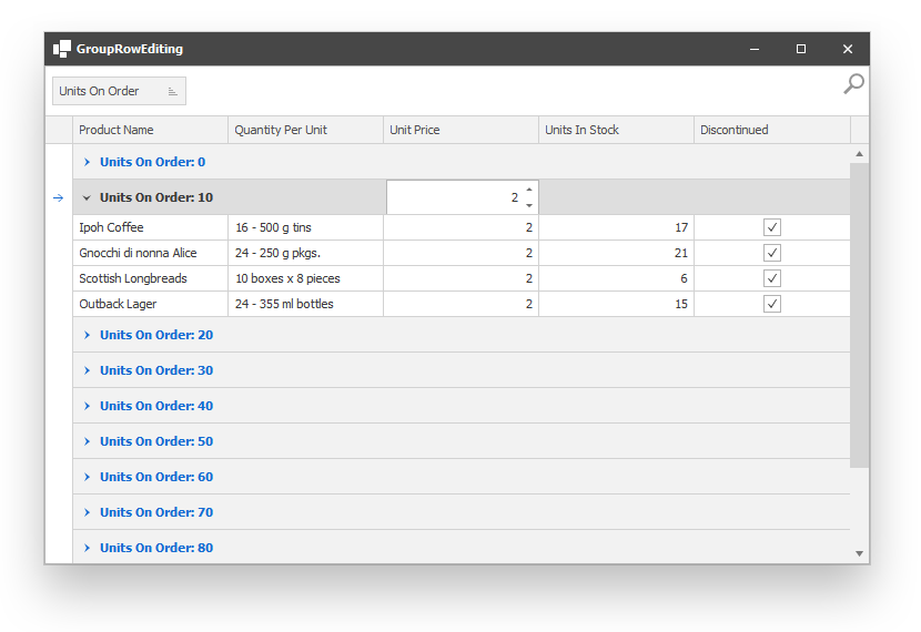 This example demonstrates how to display column editors in group rows. The user can use the editor to specify the same value for all cells in a column in a group.