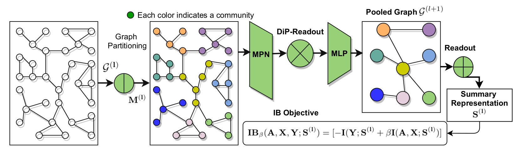 To determine different substructures present in graph data, the input graph is partitioned into communities where intra-community nodes are represented with same color and they are densely connected than inter-community nodes. After aggregating features from neighborhood using Messaging Passing Network (MPN) we apply structure-aware DiP-Readout to obtain distinguishable representations of communities with different substructures while the pooled graph of next layer is created with the edges connecting different communities. Summary representation is obtained by a readout function after the final layer. Optimizing with IB principal ensure minimal redundancy from graph data with sufficient information to predict the class labels.