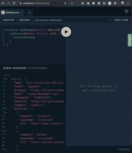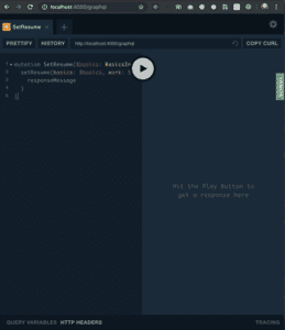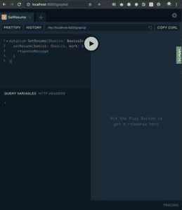 mutation SetResume($basics: BasicsInputType, $work: [WorkInputType]) { setResume(basics: $basics, work: $work) { responseMessage } }- open the