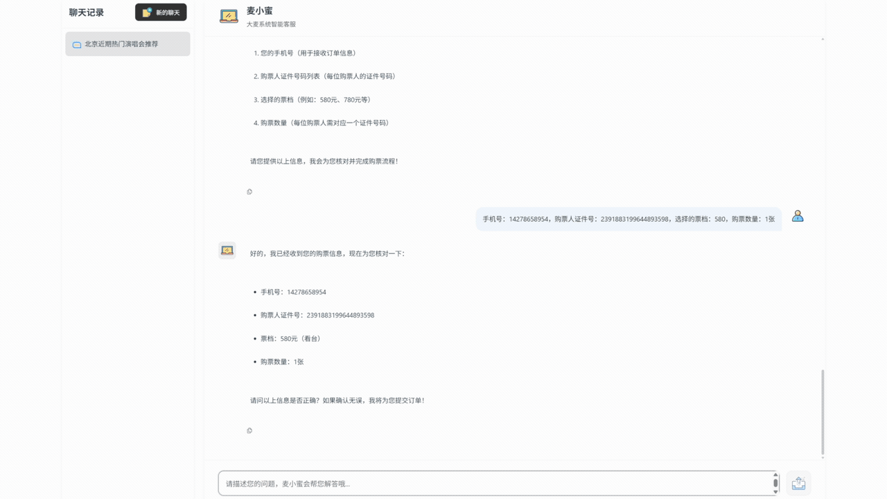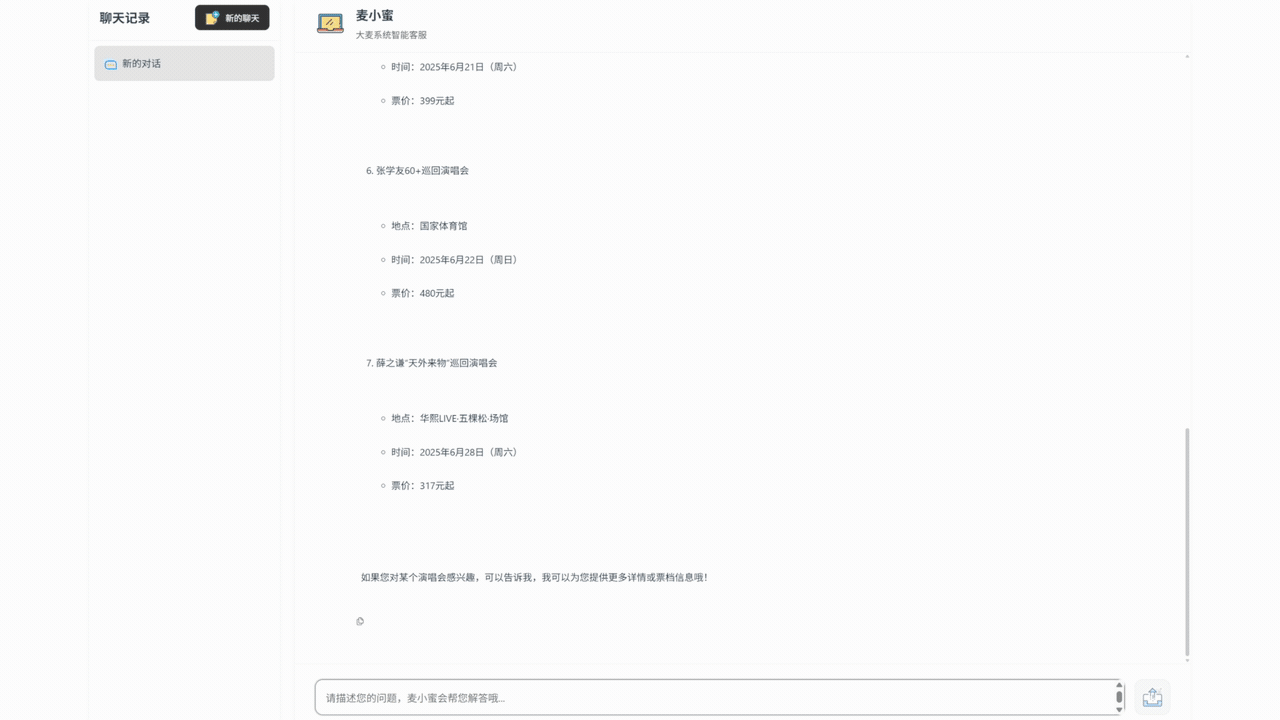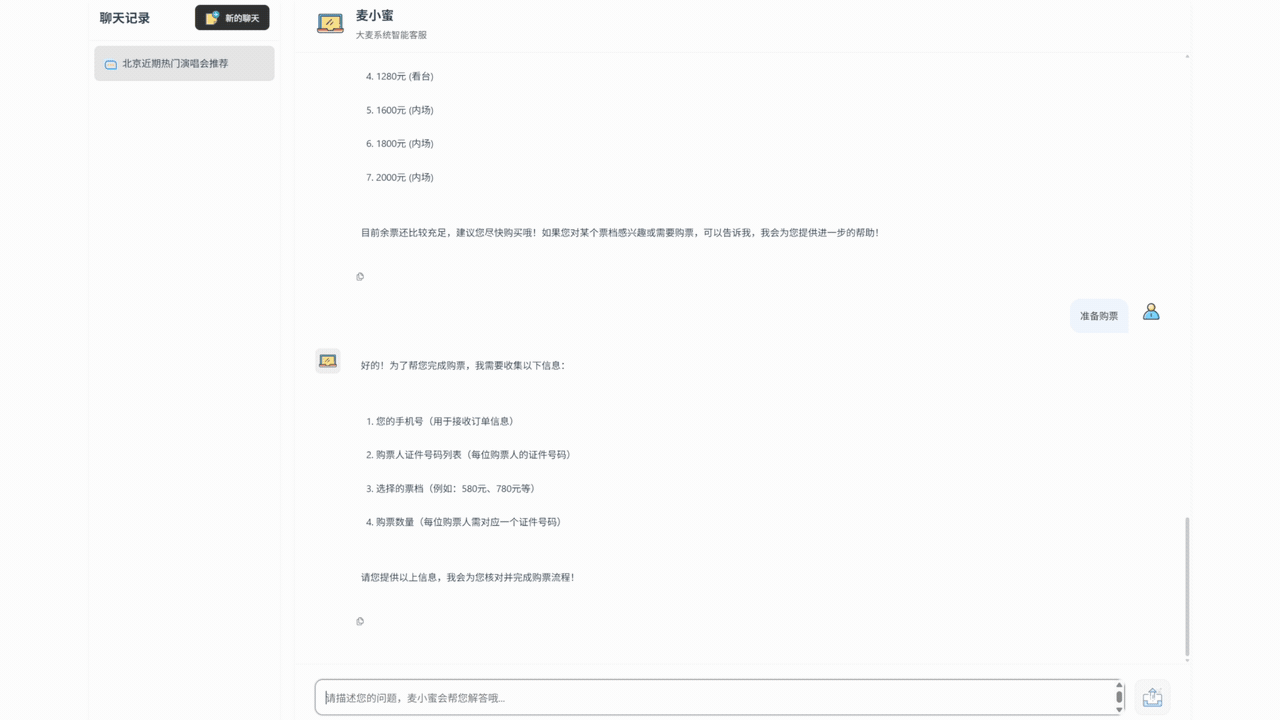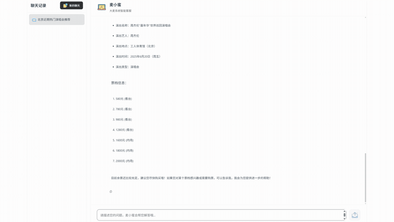 用户可以通过 AI 模型,智能的帮用户推荐想要看的节目和演唱会,显示节目和演唱会的详情介绍、演出时间、各个票档价格、是否有余票,以及帮助生成订单等功能。