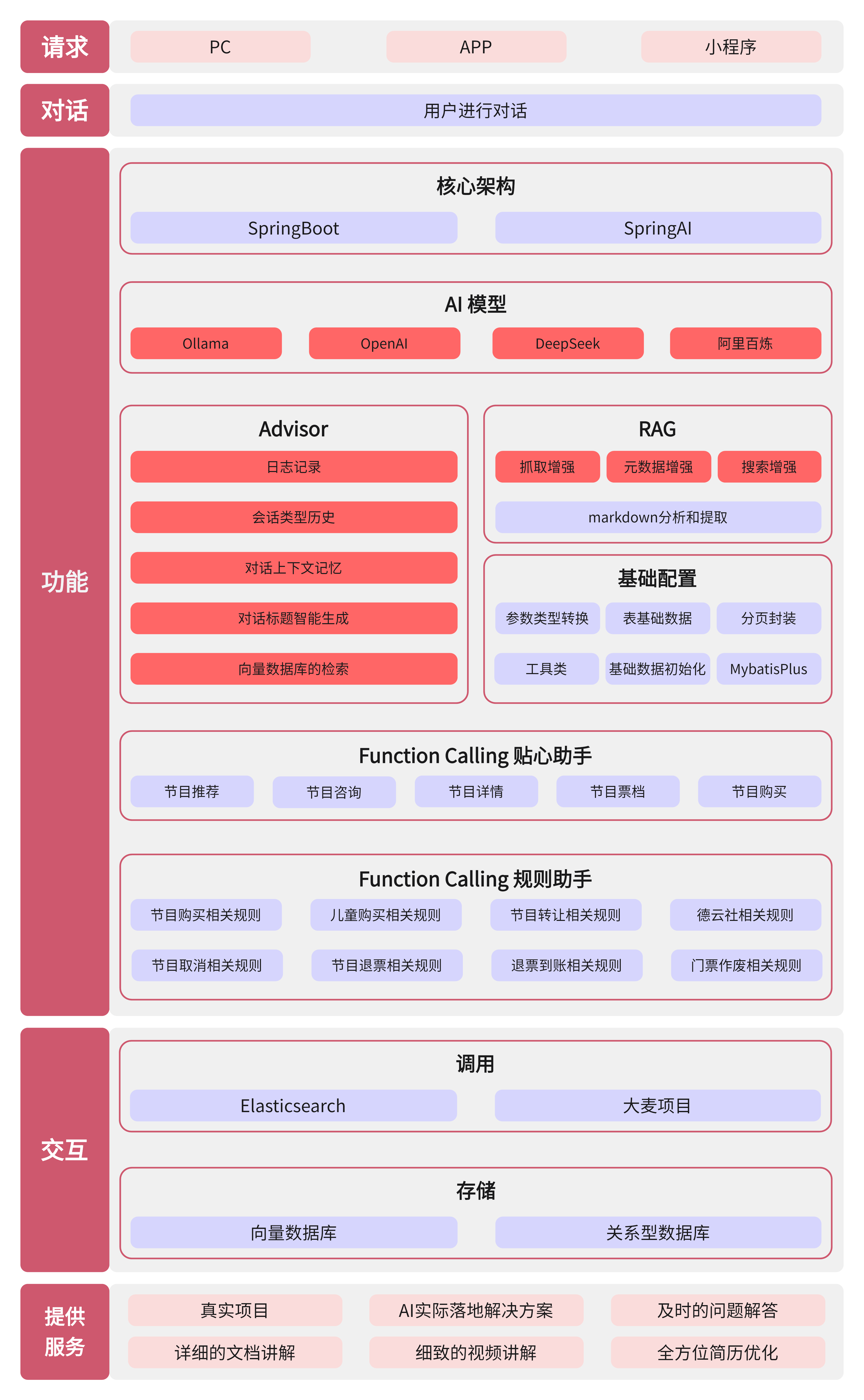项目在使用 AI 模型时,有多个模块功能,包括 Springboot和SpringAI的结合、RAG和向量数据库的解释、SpringAI操作向量数据库、MCP 和 Function Calling 操作数据、AI的拦截器 Advisor 的高阶用法 等等... ...