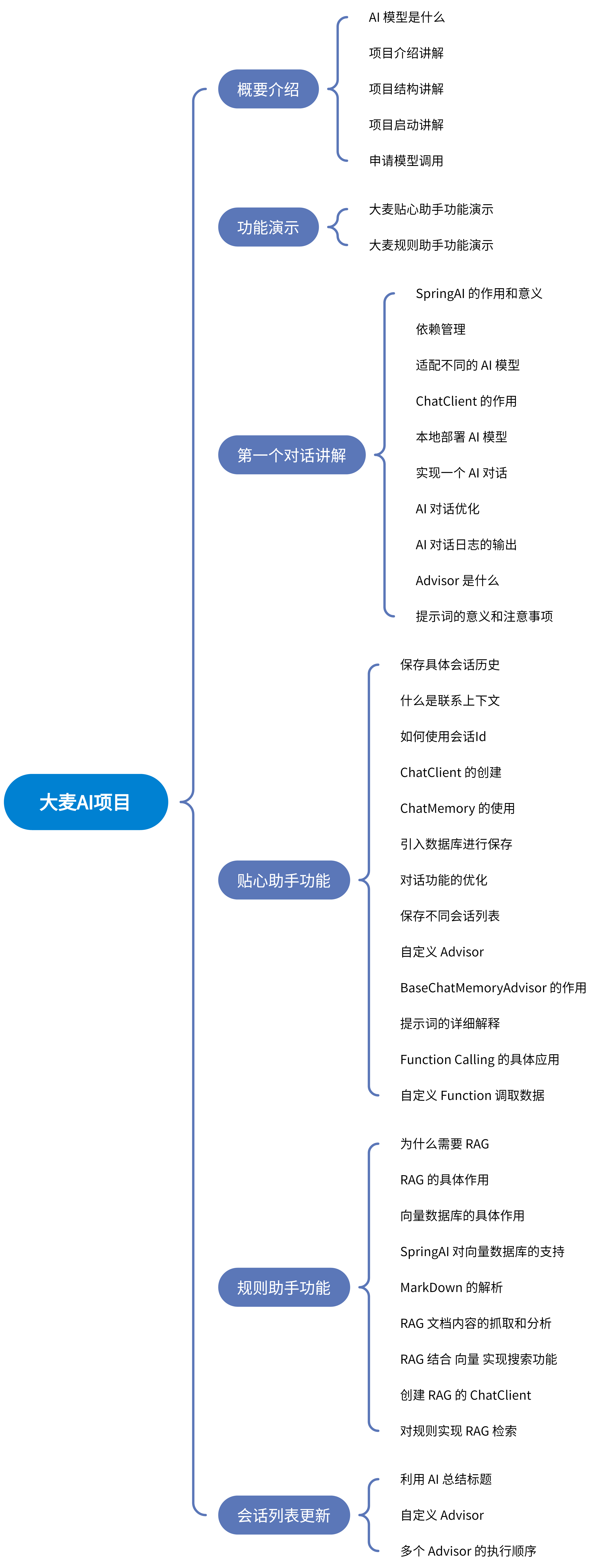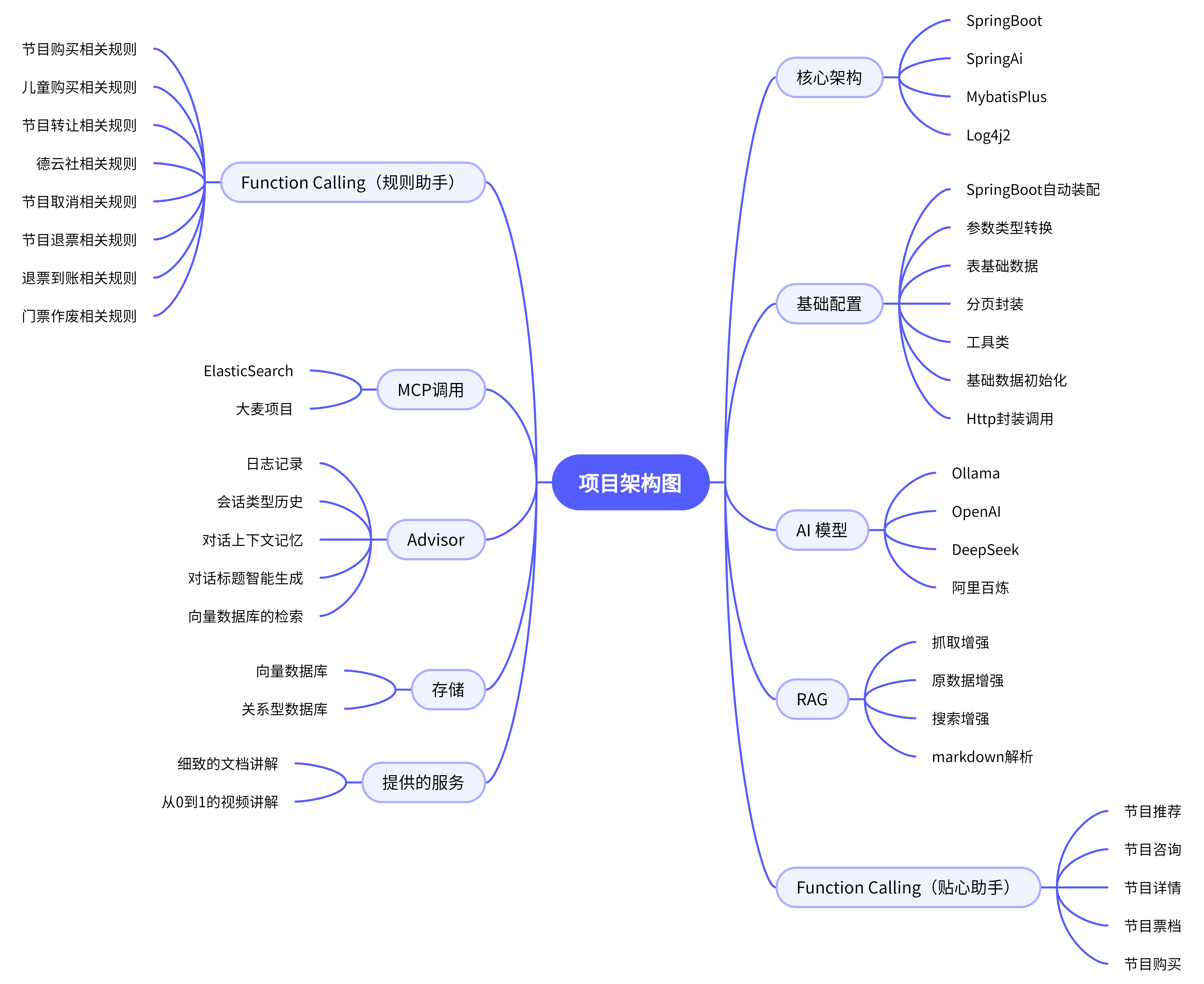 通过此业务结构图进一步详细的介绍项目中的功能,包括:核心架构、AI模型、Advisor、RAG、基础配置、贴心助手、规则助手、调用方式、存储方式等各个方面,能够对大麦AI项目的整体架构和设计有一个清晰的认知