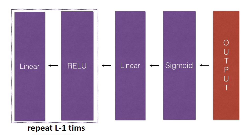 def L_model_backward(AL, Y, caches): grads = {} # the number of layers L = len(caches) m = AL.shape[1] # after this line, Y is the same shape as AL Y = Y.reshape(AL.shape) # Initializing the backpropagation dAL = - (np.divide(Y, AL) - np.divide(1 - Y, 1 - AL)) # Lth layer (SIGMOID -> LINEAR) gradients. Inputs: "dAL, current_cache". Outputs: "grads["dAL-1"], grads["dWL"], grads["dbL"] current_cache = caches[L-1] grads["dA" + str(L-1)], grads["dW" + str(L)], grads["db" + str(L)] = linear_activation_backward(dAL, current_cache, "sigmoid") # Loop from l=L-2 to l=0 for l in reversed(range(L-1)): # lth layer: (RELU -> LINEAR) gradients. # Inputs: "grads["dA" + str(l + 1)], current_cache". # Outputs: "grads["dA" + str(l)] , grads["dW" + str(l + 1)] , grads["db" + str(l + 1)] current_cache = caches[l] dA_prev_temp, dW_temp, db_temp = linear_activation_backward(grads["dA"+str(l+1)], current_cache, "relu") grads["dA" + str(l)] = dA_prev_temp grads["dW" + str(l + 1)] = dW_temp grads["db" + str(l + 1)] = db_temp return grads Update Parameters module: