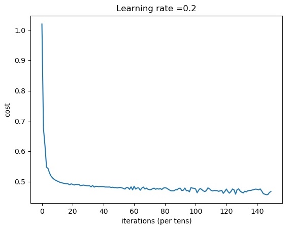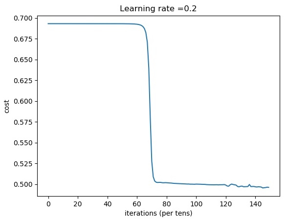 Cost after iteration 14600: 0.495909 Cost after iteration 14700: 0.496088 Cost after iteration 14800: 0.496531 Cost after iteration 14900: 0.496314 train accuracy: 72.33333333333333 %
