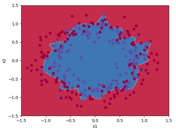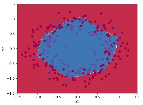 def initialize_parameters_he(layer_dimension): parameters = {} L = len(layer_dimension) for l in range(1, L): parameters["W" + str(l)] = np.random.randn(layer_dimension[l], layer_dimension[l-1]) * np.sqrt(2./layers_dims[l-1]) parameters["b" + str(l)] = np.zeros((layer_dimension[l], 1)) return parameters At first, let's test our results with the random initialization, that we could compare the difference: