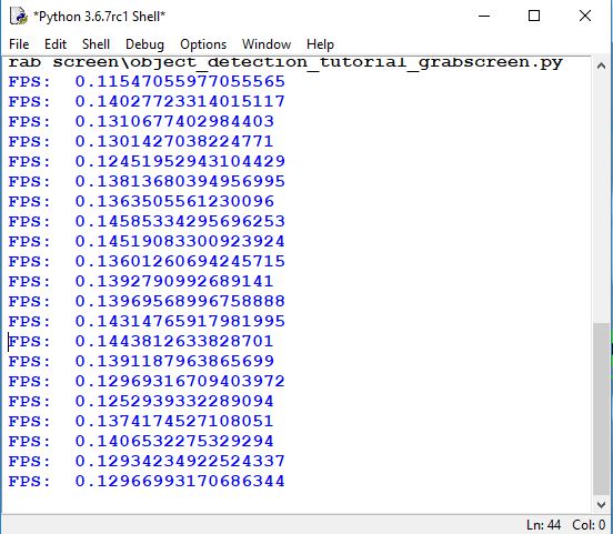 # title of our window title = "FPS benchmark" # set start time to current time start_time = time.time() # displays the frame rate every 2 second display_time = 2 # Set primarry FPS to 0 fps = 0 # Load mss library as sct sct = mss.mss() # Set monitor size to capture to MSS monitor = {"top": 40, "left": 0, "width": 800, "height": 640} Because we are not using notebook anymore, we are not using and these lines:
