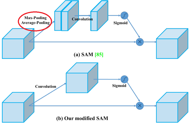 But differently from the original SAM implementation, in YOLOv4, a modified SAM is used without applying the maximum and average pooling: