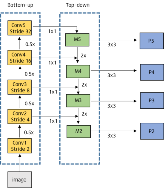 While making predictions for a particular scale, FPN upsamples (2×) the previous top-down stream and adds it with the bottom-up stream's neighboring layer (see the diagram below). The result is passed into a 3×3 convolution filter to reduce upsampling artifacts and create the feature maps P4 below for the head. In YOLOv4, the FPN concept is gradually implemented/replaced with the modified SAM, PAN, and SPP. So, let's get into them!