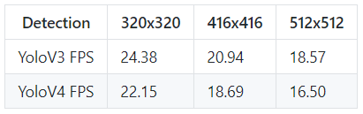 So, one of the most known methods to evaluate and compare model performance is to check the mean average precision on the same data and frames per detection. So, I tried to assess both models with 320, 416, and 512 input images sizes. All tests were done on my 1080TI GPU, with zero overclocking and 300W power, so here are the results for detection speed: