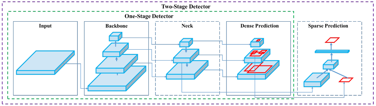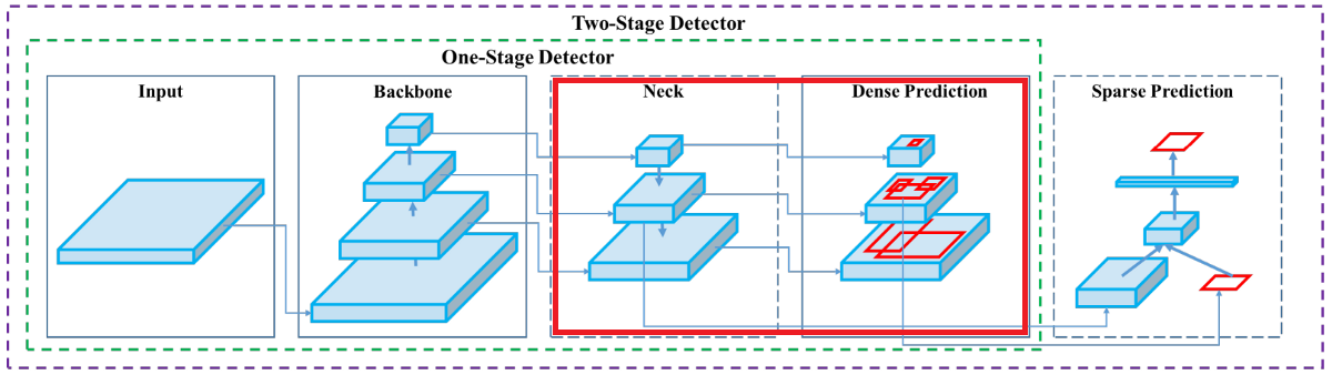 - Head (Dense Prediction) - used in one-stage-detection algorithms such as YOLO, SSD, etc.;