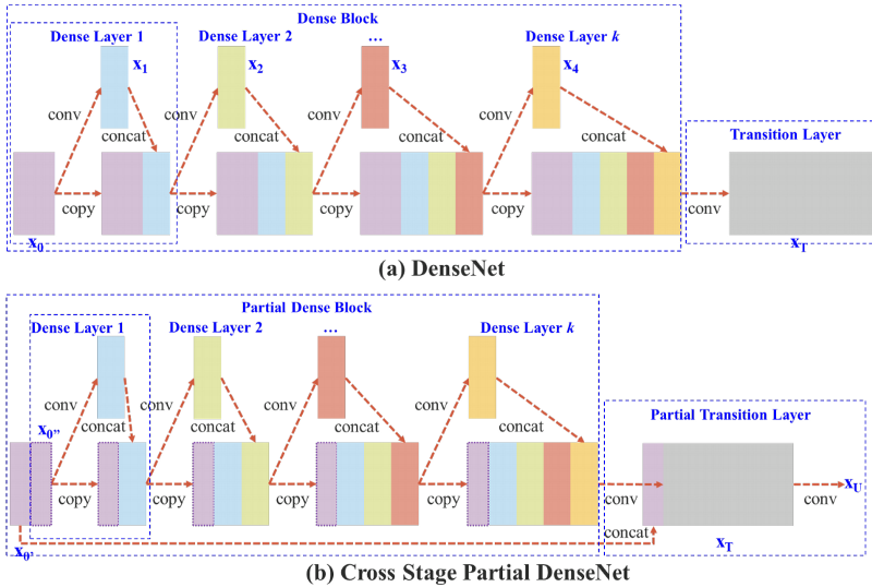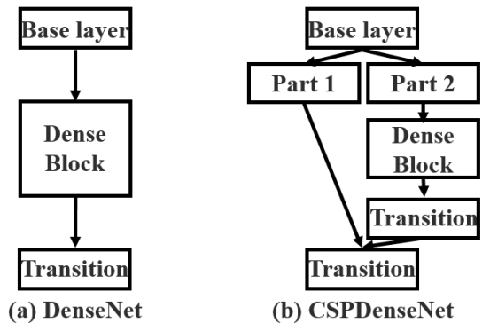 Above is an illustration of DenseNet and proposed Cross-Stage-Partial DenseNet (CSPDenseNet). CSPNet separates the feature map of the base layer into two-part. One part will go through a dense block and a transition layer. The second part will be combined with a transmitted feature map to the next stage.