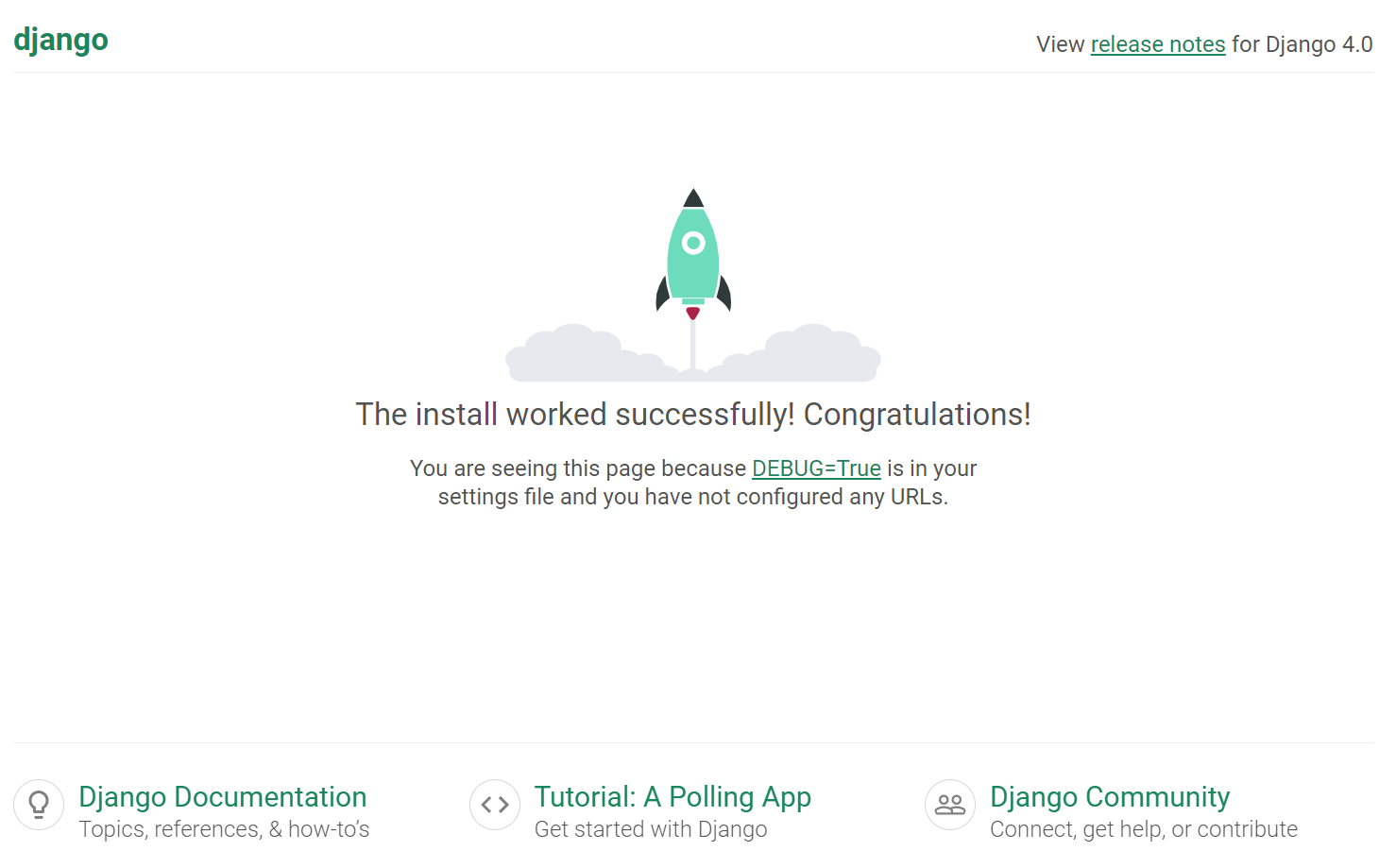 python .\manage.py runserver Watching for file changes with StatReloader Performing system checks... System check identified no issues (0 silenced). You have 18 unapplied migration(s). Your project may not work properly until you apply the migrations for app(s): admin, auth, contenttypes, sessions. Run 'python manage.py migrate' to apply them. February 21, 2022 - 15:54:26 Django version 4.0.2, using settings 'django_website.settings' Starting development server at http://127.0.0.1:8000/ Quit the server with CTRL-BREAK. We can ignore the migrations thing for now; we'll talk about that later. We now should see that our development server is currently running at http://127.0.0.1:8000 address. Open a browser and go to that address. You should see a very similar view to the following: