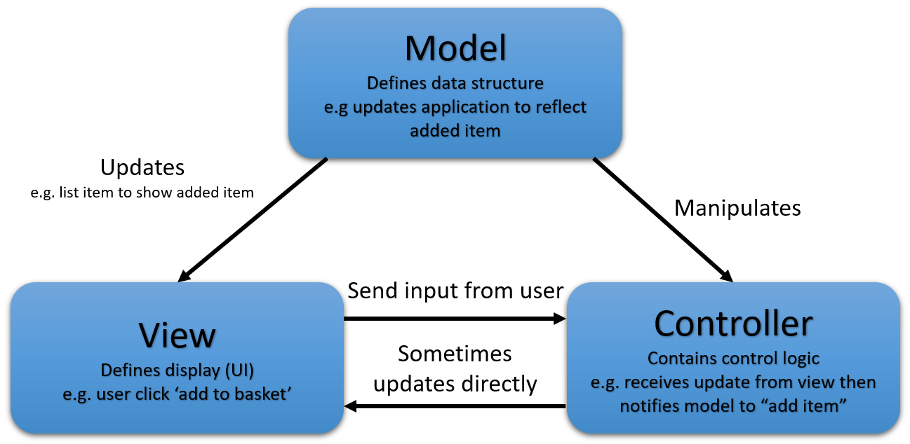 Although we call it MVC (model, view, controller), you can imagine it to be the other way around. The user will visit the URL, and the controller (urls.py) will specify a specific view (views.py). And then this view can then (optionally) be associated with your models.