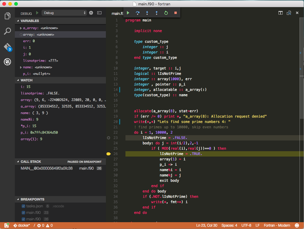 { "version": "0.2.0", "cwd": "${workspaceRoot}", "configurations": [ { "name": "Debug", "type": "gdb", "request": "launch", "target": "./foo", "cwd": "${workspaceRoot}", "ssh": { "forwardX11": false, "host": "127.0.0.1", "port":222, "cwd": "/usr/src/myapp/", "password": "foo", "user": "foo", "bootstrap": "cd /usr/src/myapp/; gfortran -g -o foo main.f90" } } ] } Note that the compilation is run inside the container baser on the “bootstrap” command.