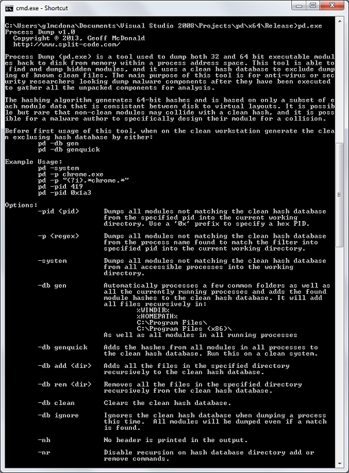 1.   Added a new running mode where Process Dump monitors running processes, and dumps any process that attempts to close. This is great for dumping malware after it unpacks itself. Start Process Dump like pd64.exe -closemon, then afterwards run the malware file. It will dump all processes to the local folder as they close. When you would like to stop the monitor, just press CTRL-C to stop Process Dump.