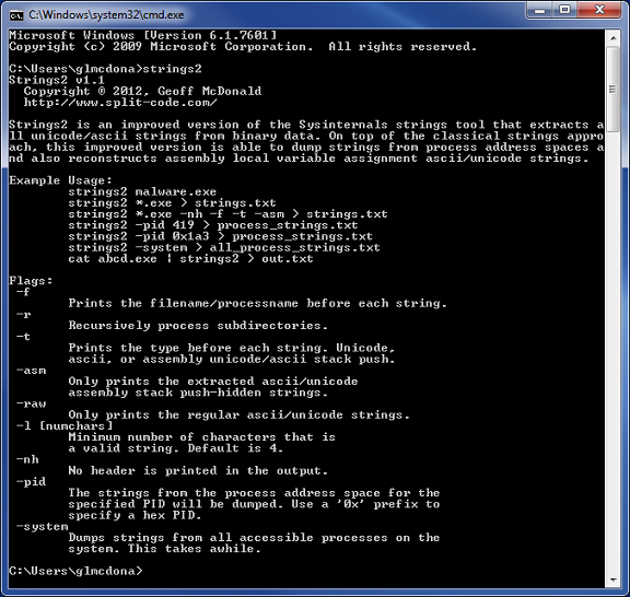 Also, I just released version 1.2 of strings2. I added argument flags '-a' and '-u' to extract either only ascii or only unicode strings. By default it extracts both. In this version I also patched a rare bug when processing filenames.