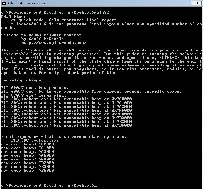 MALM is a 32 and 64bit Windows OS command-prompt tool for monitoring malware. While it is running, MALM monitors your system for new processes, new modules in existing processes, and new executable heaps in existing processes. As it notices changes, MALM will output observations to the console. When MALM is terminated by CTRL-C, it will generate a final report of it's findings. This tool is particularly useful for monitoring where the malware resides after execution. Run this tool with administrator privileges for best results.
