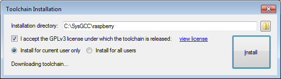 - Once the installation of the toolchain completes, the installed toolchain will appear in the toolchain selector. If you are using VisualGDB 5.4 or later with the latest Raspberry Pi toolchain, you can click on the SD card icon to the right from the toolchain selector to download the compatible SD card image from the Raspberry Pi website automatically: