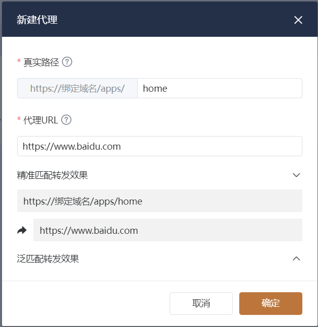 Step.02 填写要转发至的代理URL,并了解我们的精准匹配和泛匹配转发效果,配置即可完成