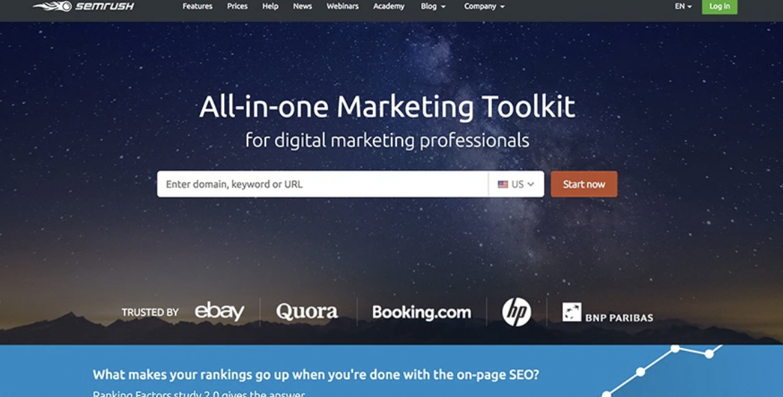 像SEMRush这样的营销 SEO 工具往往是 SEO 社区中粉丝的最爱。专家们喜欢它们可以让您轻松评估您的排名以及识别变化和新的排名机会。该 SEO 工具最受欢迎的功能之一是域与域分析,它可以让您轻松地将您的网站与竞争对手进行比较。