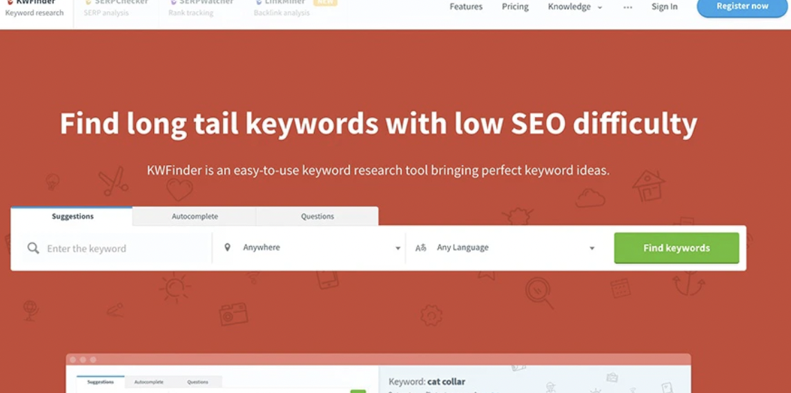 像KWFinder这样的 SEO 关键词工具可以帮助你找到竞争程度较低的长尾关键词。专家使用这个 SEO 工具来找到最好的关键词,并对反向链接和 SERP(搜索引擎结果页面)运行分析报告。