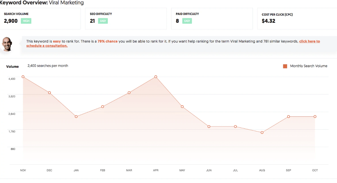 Ubersuggest 报告中包含的指标包括关键词数量、竞争度、每次点击费用和季节性趋势。该工具非常适合有机搜索引擎优化和付费点击付费,可以帮助你确定关键字是否值得定位以及其竞争力如何。