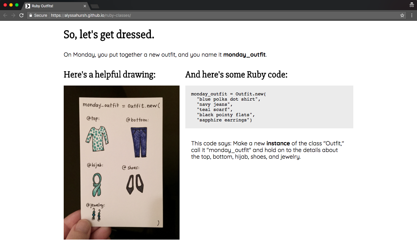 A friend's mentee was struggling to understand the concept of classes, so I did a little doodling and wrote up a short lesson. Deployed on Github pages here.