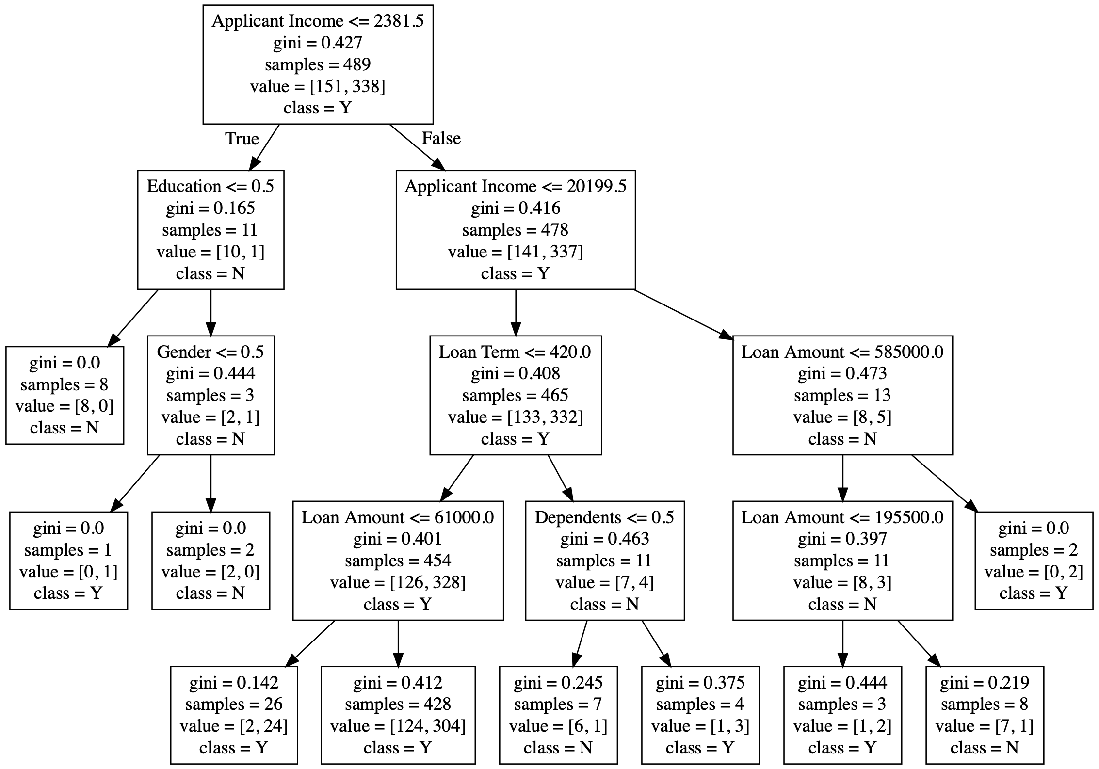 "model": { "type": "DecisionTreeClassifier", "scoring_params": { "tree": { "isleaf": false, "field": "Applicant Income", "split_value": 2381.5, "l": { "isleaf": false, "field": "Education", "split_value": 0.5, "l": { "isleaf": true, "class": 0 }, "r": { "isleaf": false, "field": "Gender", "split_value": 0.5, "l": { "isleaf": true, "class": 1 }, "r": { "isleaf": true, "class": 0 } } }, "r": { "isleaf": false, "field": "Applicant Income", "split_value": 20199.5, "l": { "isleaf": false, "field": "Loan Term", "split_value": 420.0, "l": { "isleaf": false, "field": "Loan Amount", "split_value": 61000.0, "l": { "isleaf": true, "class": 1 }, "r": { "isleaf": true, "class": 1 } }, "r": { "isleaf": false, "field": "Dependents", "split_value": 0.5, "l": { "isleaf": true, "class": 0 }, "r": { "isleaf": true, "class": 1 } } }, "r": { "isleaf": false, "field": "Loan Amount", "split_value": 585000.0, "l": { "isleaf": false, "field": "Loan Amount", "split_value": 195500.0, "l": { "isleaf": true, "class": 1 }, "r": { "isleaf": true, "class": 0 } }, "r": { "isleaf": true, "class": 1 } } } } } }