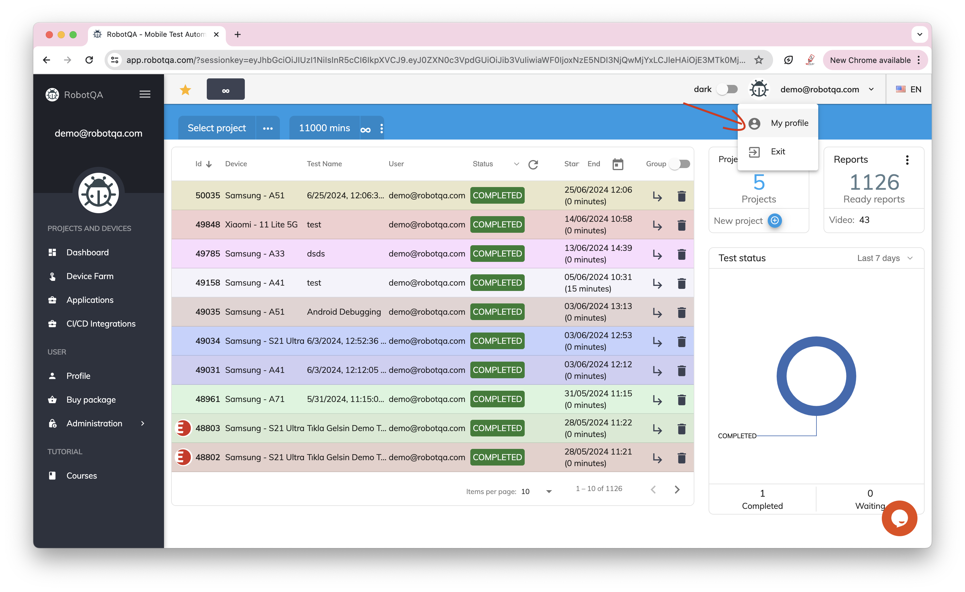 When you finished your debugging, stop the project run as usual. * Important Note: Close the live testing page when you finished your testing * RobotQA offers reports for each debugging. To get video and logs about your debugging, login to RobotQA login page and click the latest test on dashboard. You will see the this report.