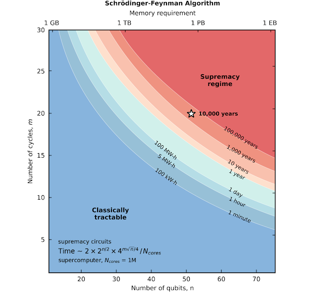 Estimate of the equivalent classical computation time assuming 1M CPU cores for quantum supremacy circuits as a function of the number of qubits and number of cycles for the Schrödinger-Feynman algorithm. The star shows the estimated computation time for the largest experimental circuits. |