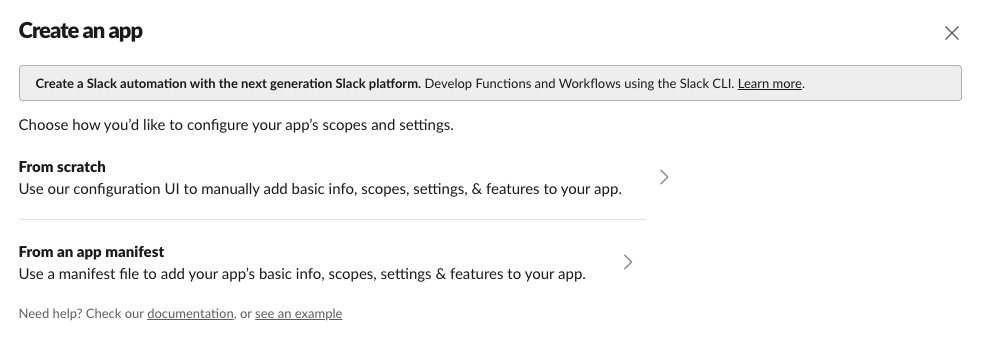From Scratch. Enter your App Name (e.g. Airbyte Sync Notifications) and pick your desired Slack workspace. -