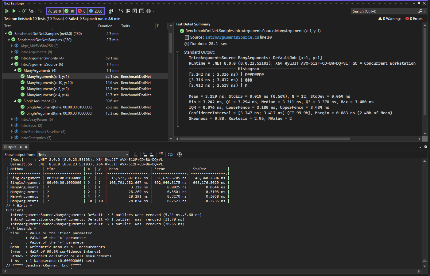 One more place where you can view the results is in each individual test's output messages. In Visual Studio, this can be viewed by clicking on the test in the Test Explorer after running it and looking at the Test Detail Summary. Since this only displays statistics for a single benchmark case, it does not show the tabulated view that compares multiple benchmark cases. Instead, it displays a histogram and various other useful statistics. Not all IDEs support displaying these output messages, so you may only be able to view the results using the "Tests" output.