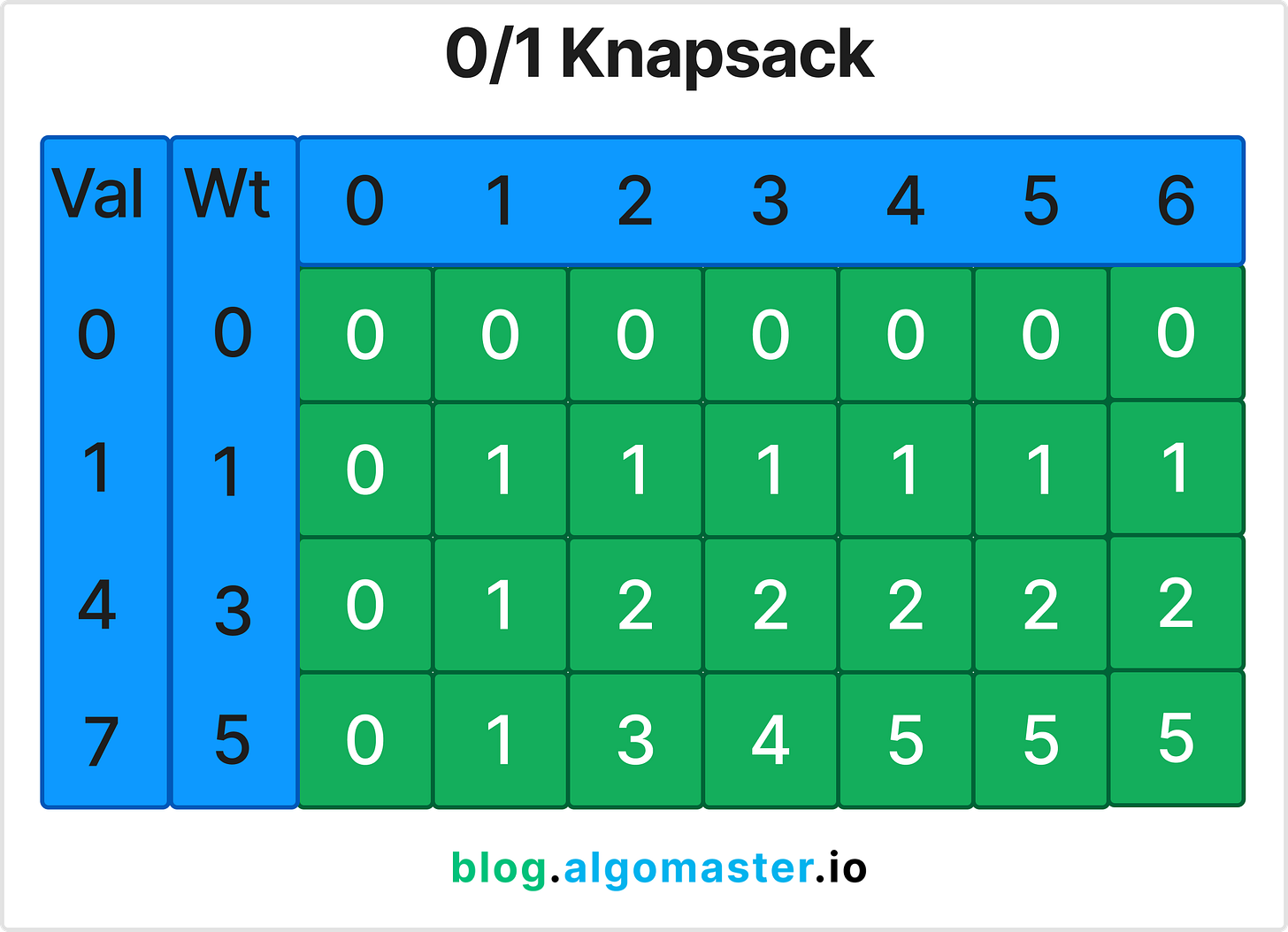 Each item can be chosen only once (hence the "0/1" - you either take it or you don't).