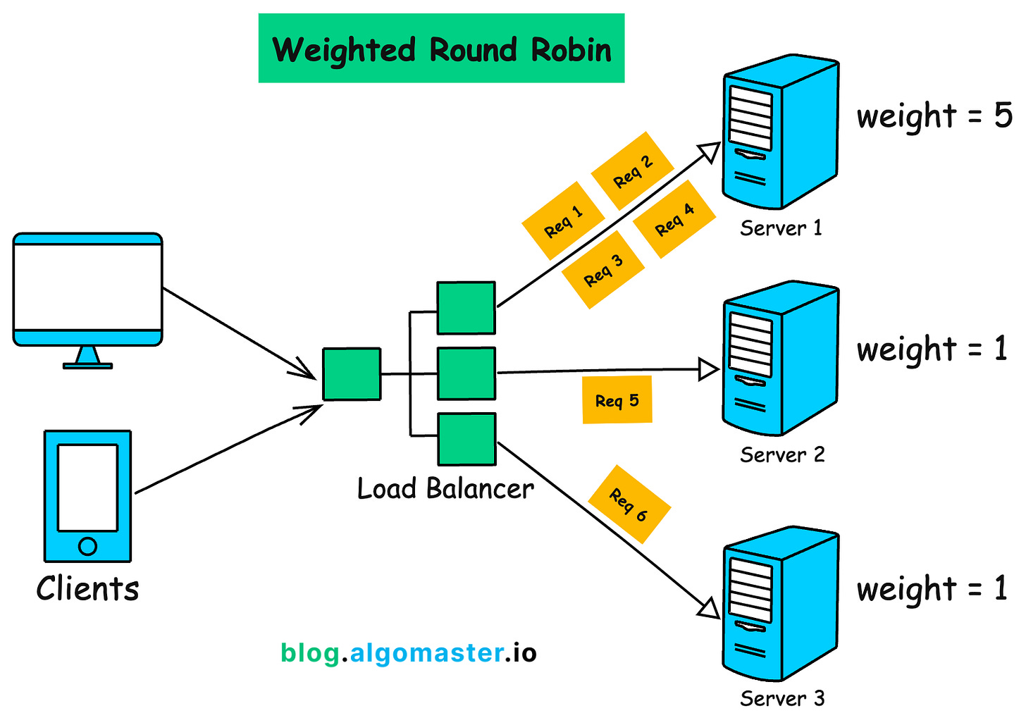 Weighted Round Robin: Distributes based on server capacity, good for heterogeneous environments.