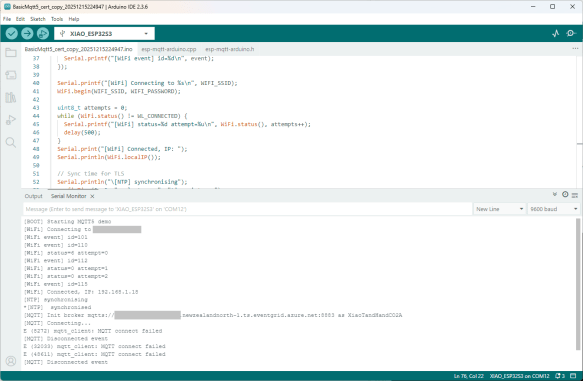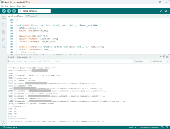 // constants.h #pragma once const uint16_t MQTT_PORT = 8883; // This certificate is used to authenticate the host static const char CA_ROOT_PEM[] PROGMEM = R"PEM( -----BEGIN CERTIFICATE----- ... -----END CERTIFICATE----- -----BEGIN CERTIFICATE----- ... -----END CERTIFICATE----- )PEM"; // Secrets.h #pragma once // Wi-Fi credentials const char* WIFI_SSID = "SSID"; const char* WIFI_PASSWORD = "Password"; // MQTT settings //const char* MQTT_SERVER_URI = "MyBroker.newzealandnorth-1.ts.eventgrid.azure.net"; const char* MQTT_SERVER_URL = "mqtts://MyBroker.newzealandnorth-1.ts.eventgrid.azure.net:8883"; /* // This is A setup, below are B, C, D, & E const char* MQTT_CLIENTID = "XiaoTandHandCO2A"; const char* MQTT_TOPIC_PUBLISH = "devices/XiaoTandHandCO2A/sequence"; const char* MQTT_TOPIC_SUBSCRIBE = "devices/XiaoTandHandCO2A/configuration"; static const char CLIENT_CERT_PEM[] PROGMEM = R"PEM( -----BEGIN CERTIFICATE----- -----END CERTIFICATE----- -----BEGIN CERTIFICATE----- Intermediate certificate -----END CERTIFICATE----- )PEM"; static const char CLIENT_KEY_PEM[] PROGMEM = R"PEM( -----BEGIN PRIVATE KEY----- -----END PRIVATE KEY----- )PEM"; */ const char* MQTT_CLIENTID = "XiaoTandHandCO2B"; const char* MQTT_TOPIC_PUBLISH = "devices/XiaoTandHandCO2B/sequence"; const char* MQTT_TOPIC_SUBSCRIBE = "devices/XiaoTandHandCO2V/configuration"; static const char CLIENT_CERT_PEM[] PROGMEM = R"PEM( -----BEGIN CERTIFICATE----- -----END CERTIFICATE----- -----BEGIN CERTIFICATE----- Intermediate certificate -----END CERTIFICATE----- )PEM"; static const char CLIENT_KEY_PEM[] PROGMEM = R"PEM( -----BEGIN PRIVATE KEY----- -----END PRIVATE KEY----- )PEM"; /* const char* MQTT_CLIENTID = "XiaoTandHandCO2C"; const char* MQTT_TOPIC_PUBLISH = "devices/XiaoTandHandCO2C/sequence"; const char* MQTT_TOPIC_SUBSCRIBE = "devices/XiaoTandHandCO2V/configuration"; static const char CLIENT_CERT_PEM[] PROGMEM = R"PEM( -----BEGIN CERTIFICATE----- -----END CERTIFICATE----- -----BEGIN CERTIFICATE----- Intermediate certificate -----END CERTIFICATE----- )PEM"; static const char CLIENT_KEY_PEM[] PROGMEM = R"PEM( -----BEGIN PRIVATE KEY----- -----END PRIVATE KEY----- )PEM"; */ /* const char* MQTT_CLIENTID = "XiaoTandHandCO2D"; const char* MQTT_TOPIC_PUBLISH = "devices/XiaoTandHandCO2D/sequence"; const char* MQTT_TOPIC_SUBSCRIBE = "devices/XiaoTandHandCO2V/configuration"; static const char CLIENT_CERT_PEM[] PROGMEM = R"PEM( -----BEGIN CERTIFICATE----- -----END CERTIFICATE----- -----BEGIN CERTIFICATE----- Intermediate certificate -----END CERTIFICATE----- )PEM"; static const char CLIENT_KEY_PEM[] PROGMEM = R"PEM( -----BEGIN PRIVATE KEY----- -----END PRIVATE KEY----- )PEM"; */ /* const char* MQTT_CLIENTID = "XiaoTandHandCO2E"; const char* MQTT_TOPIC_PUBLISH = "devices/XiaoTandHandCO2E/sequence"; const char* MQTT_TOPIC_SUBSCRIBE = "devices/XiaoTandHandCO2V/configuration"; static const char CLIENT_CERT_PEM[] PROGMEM = R"PEM( -----BEGIN CERTIFICATE----- -----END CERTIFICATE----- -----BEGIN CERTIFICATE----- Intermediate certificate -----END CERTIFICATE----- )PEM"; static const char CLIENT_KEY_PEM[] PROGMEM = R"PEM( -----BEGIN PRIVATE KEY----- -----END PRIVATE KEY----- )PEM"; */ To make deployments easier I have some software which stores the certificates in an optional “secure element” like the Microchip ATECC608C(The Seeedstudio Edgebox100 documentation refers to an optional Microchip ATECC680A but these are “not recommended for new designs”). This isn’t a great solution but deployments easier and is “better” than a string constant in the binary.