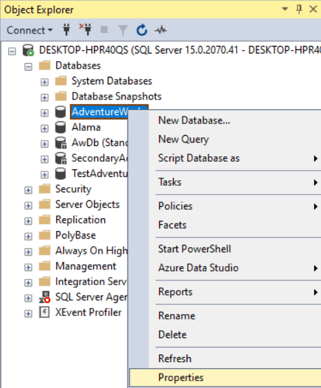We also need to know the logical names of database files to restore a database on a Linux server. These can be viewed in SSMS by right-clicking on the database and selecting “Properties.”