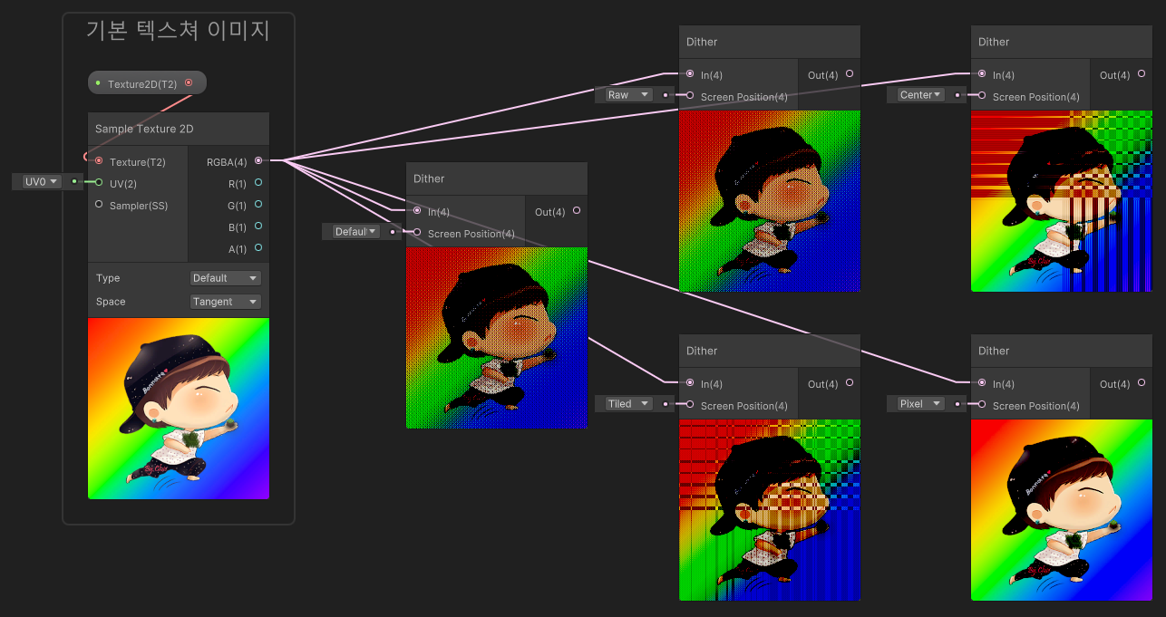 Dither는 양자화 오류를 무작위화하는 데 사용되는 의도적인 형태의 노이즈입니다. 이미지의 컬러 밴딩과 같은 대규모 패턴을 방지하는 데 사용됩니다. Dither 노드는 패턴의 균일한 분포를 보장하기 위해 화면 공간에 디더링을 적용합니다. 화면 위치를 입력하기 위해 다른 노드를 연결하여 조정할 수 있습니다.