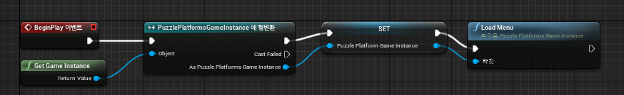 블루프린트에서 gameinstance를 획득후 cast한 후에 load menu exec 함수 실행을 하면