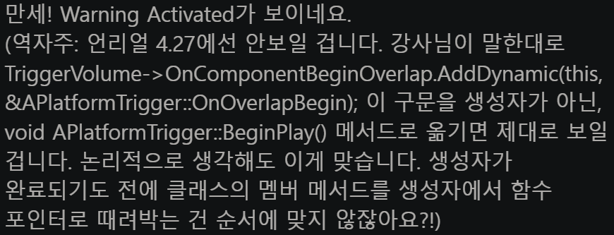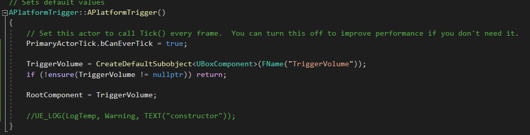 TriggerVolume->OnComponentBeginOverlap.AddDynamic(this, &APlatformTrigger::OnOverlapBegin);