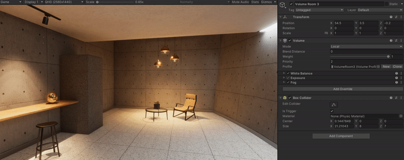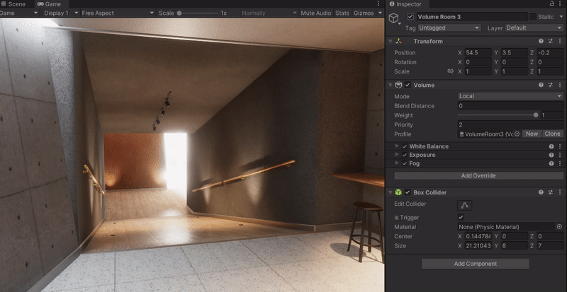 Volume Room 3의 Exposure의 오버라이드 여부에 따라 Global Volume의 속성이 무시되고 Local Volume의 속성으로 재정의 되는것을 볼 수 있다.