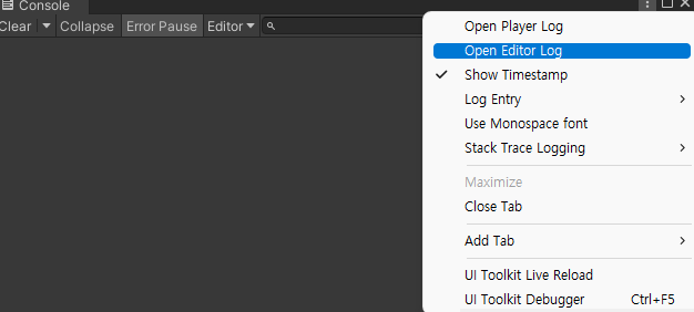 콘솔창에서 Open Editor Log를 통해 로그를 확인할 수 있습니다.