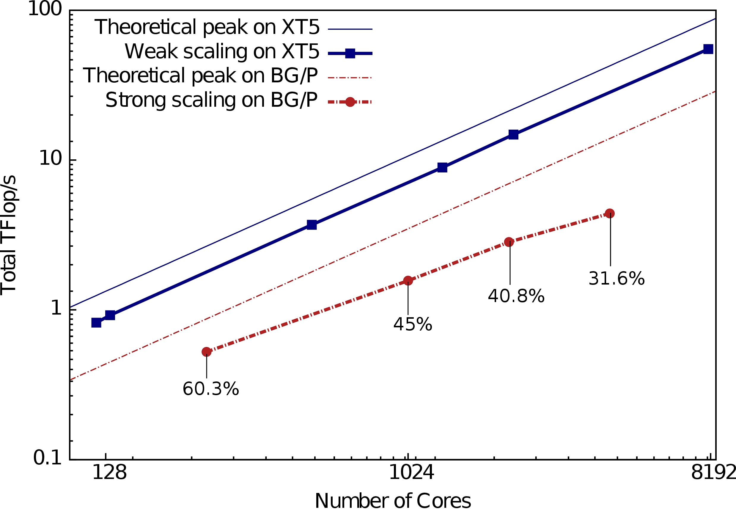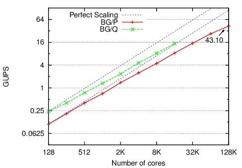We used a Charm++ group to partition the global table across the nodes in a run. Each element of the group allocates its part of the global table, generates random update keys, and sends the updates to the appropriate destination.