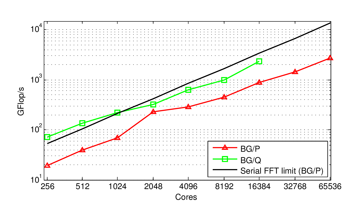 Our implementation of Global FFT takes input size N and performs a complex 1D FFT on an NxN matrix where subsequent rows are contiguous data elements of a double precision complex vector. Three all-to-all transposes are required to perform the FFT and unscramble the data. All-to-all operations are executed via point-to-point messages and external libraries (FFTW or ESSL) perform serial FFTs on the rows of the matrix.