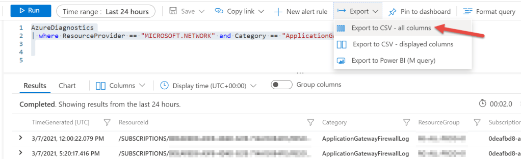 The following PowerShell script will download logs for the past 24hrs from the WAF’s Log Analytics Workspace and export a CSV of the results.