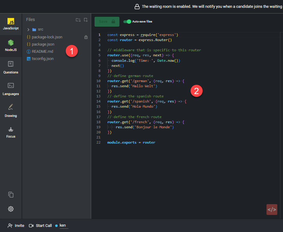Lorsque vous changez de langage dans une question, le code du langage précédent est automatiquement affiché dans l'éditeur du nouveau langage sous forme de commentaire. Cela vous permet, ainsi qu'à votre candidat, de ne pas perdre votre travail lorsque vous passez d'un langage à un autre.