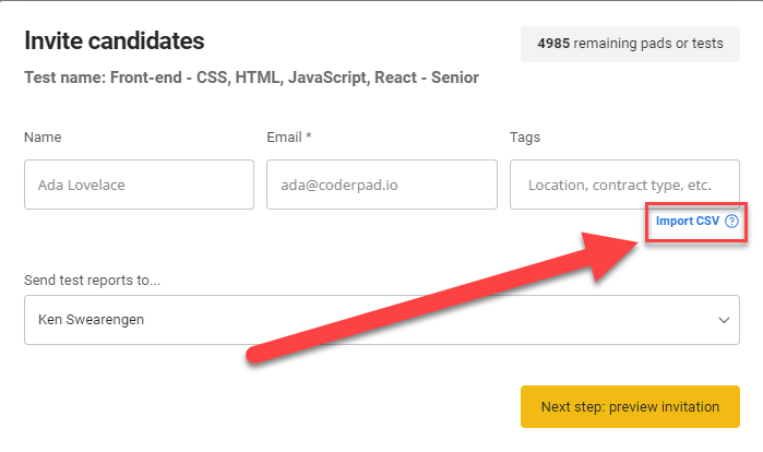 Vous pouvez importer par lots des candidats à partir d'un fichier CSV pour les inviter à un test.