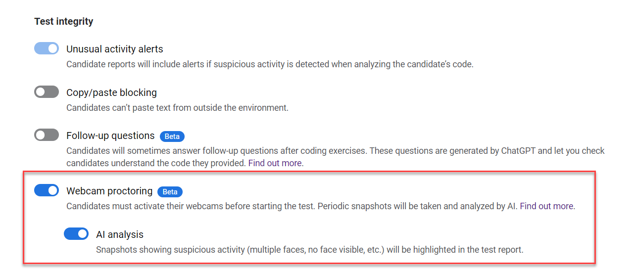 To enable this feature, navigate to your Test Settings and scroll down to the Test integrity. Turn the Webcam proctoring switch on.