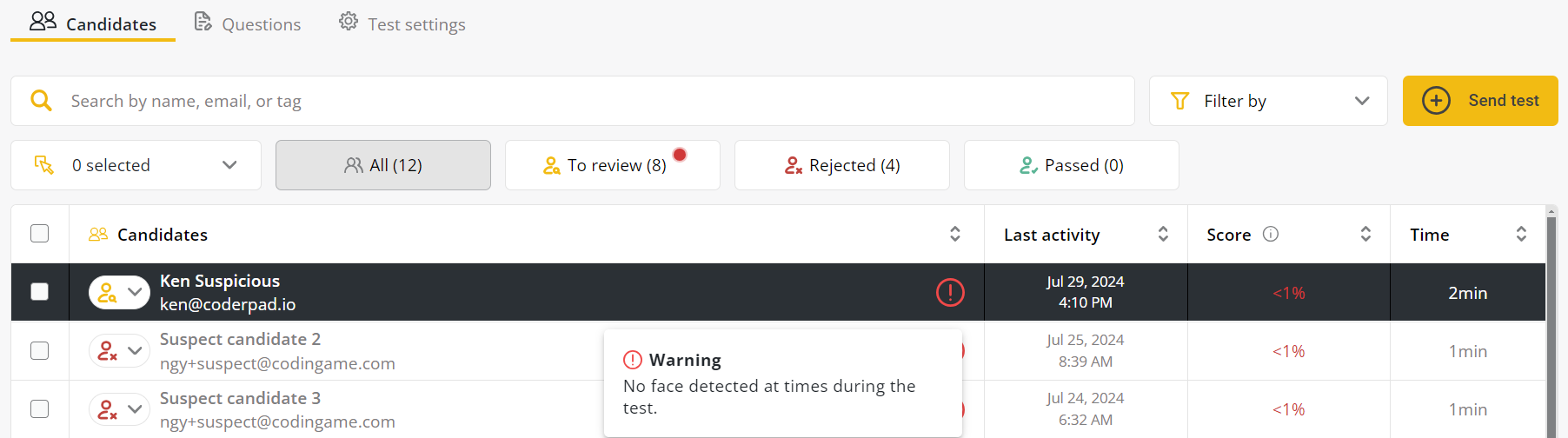 After candidates complete the test, you can see any relevant suspicious activity notifications on the Candidates tab.
