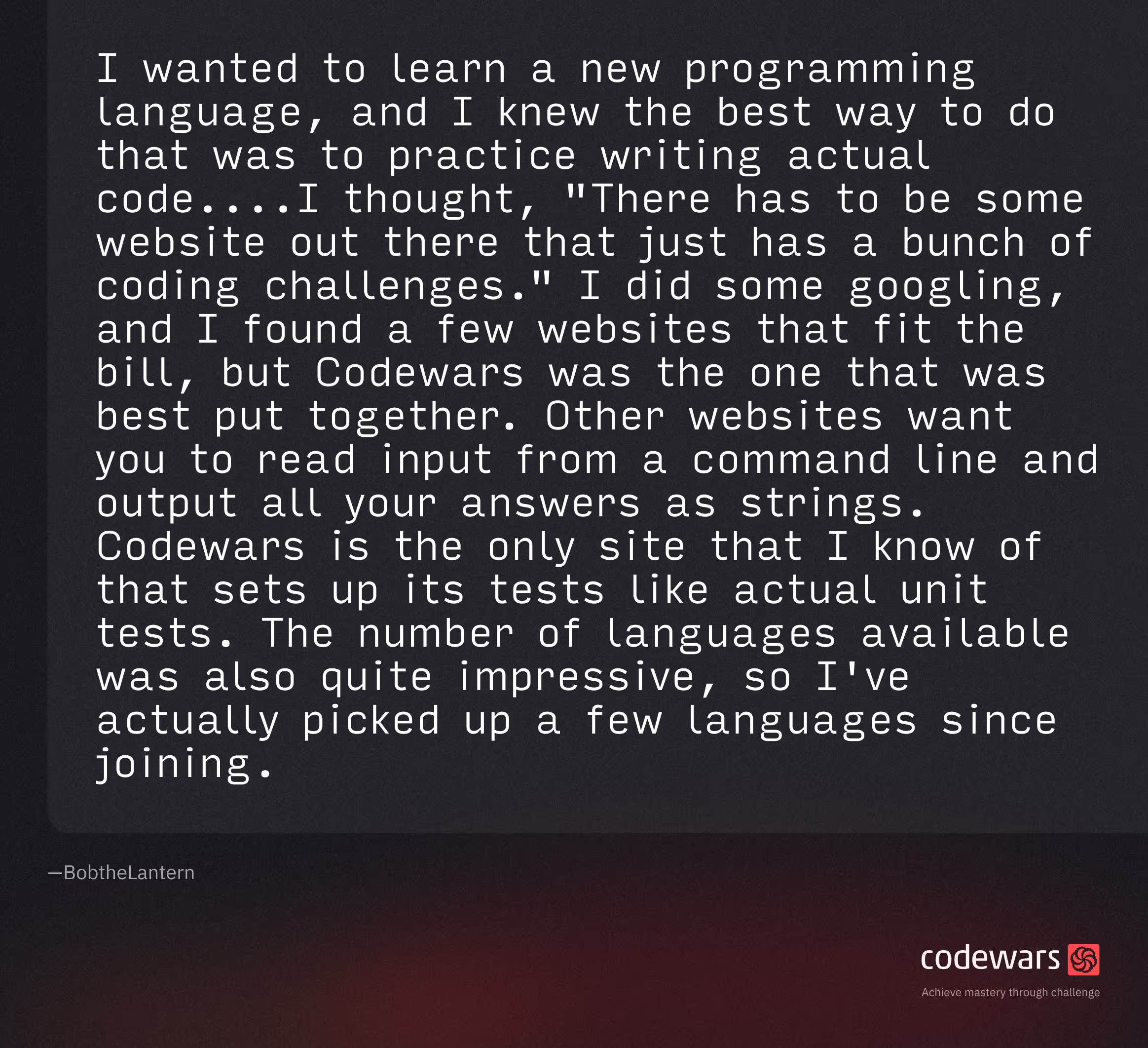 "I wanted to learn a new programming language, and I knew the best way to do that was to practice writing actual code....I thought, "There has to be some website out there that just has a bunch of coding challenges." I did some googling, and I found a few websites that fit the bill, but Codewars was the one that was best put together. Other websites want you to read input from a command line and output all your answers as strings. Codewars is the only site that I know of that sets up its tests like actual unit tests. The number of languages available was also quite impressive, so I've actually picked up a few languages since joining." - BobtheLantern