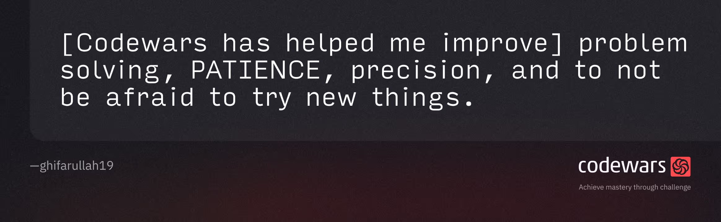 "[Codewars has helped me improve] problem solving, PATIENCE, precision, and to not be afraid to try new things." - ghifarullah19